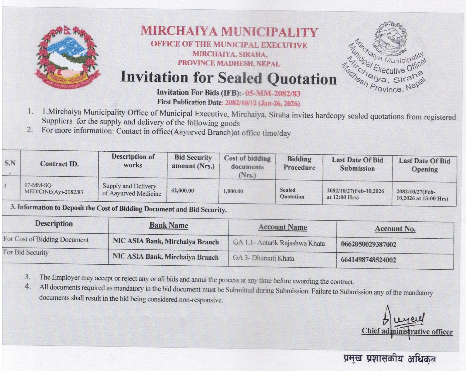 invitation for sealed quotation Supply and delivery of Aayurved Medicine